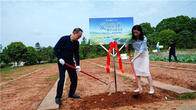长沙市第三社会福利院精神障碍社区康复服务孵化基地主任罗月红(右)与珍酒李渡集团党委书记、CEO兼湘窖酒业总裁颜涛(左)共同树立公益牌